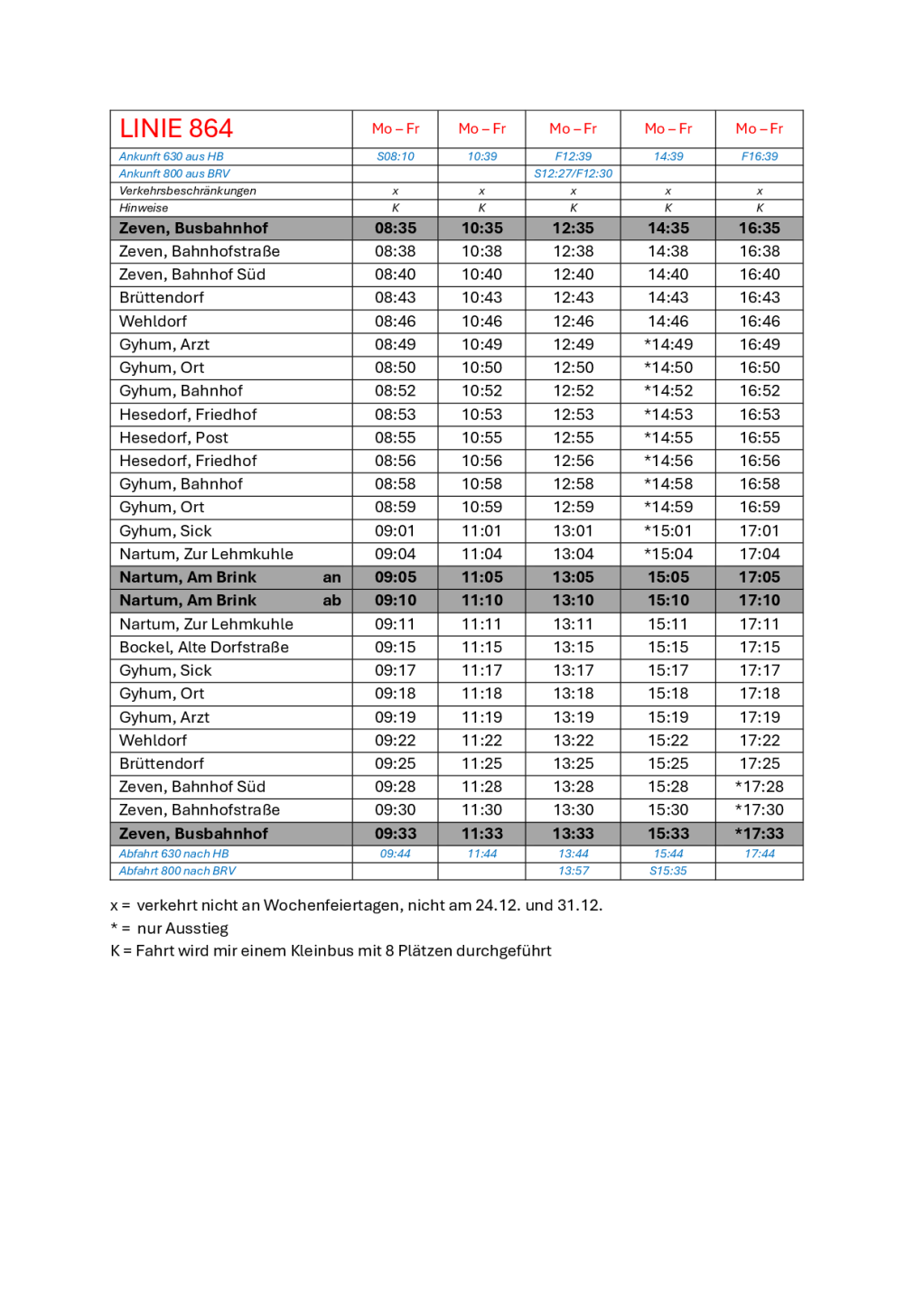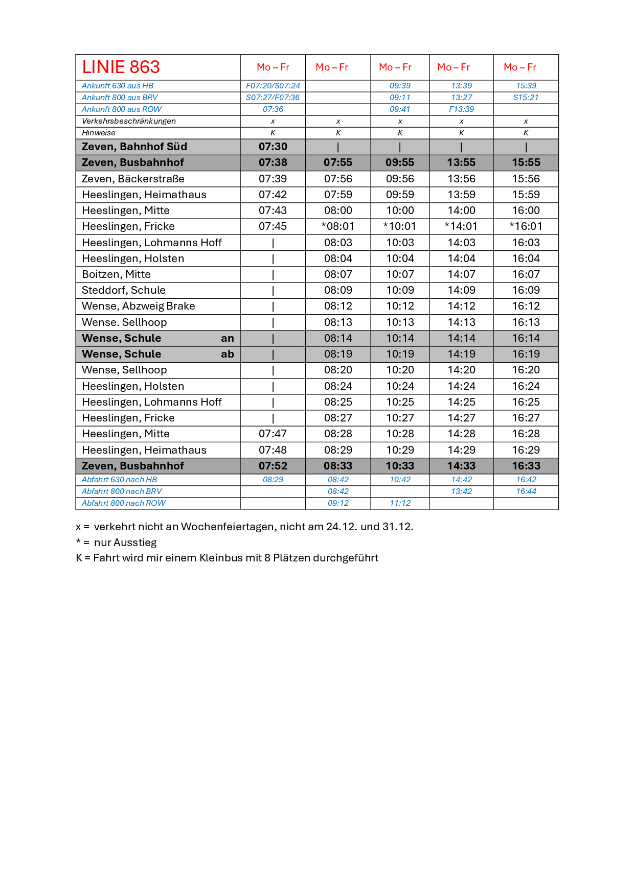 Bei unserem Bürgerbus handelt es sich um einen Bus, der die Linien 863 und 864 nacheinander abfährt. Somit muss keine Fahrt in Zeven enden, sondern man fährt einfach im Bus weiter, bis man sein Endziel erreicht hat. Dieses kann in Heeslingen, in Nartum oder in Wense sein. Am Busbahnhof in Zeven kann man auch in einen weiterführenden Bus des VBN umsteigen. Das passende Ticket dafür wird gleich bei Fahrtantritt im Bürgerbus gelöst.
